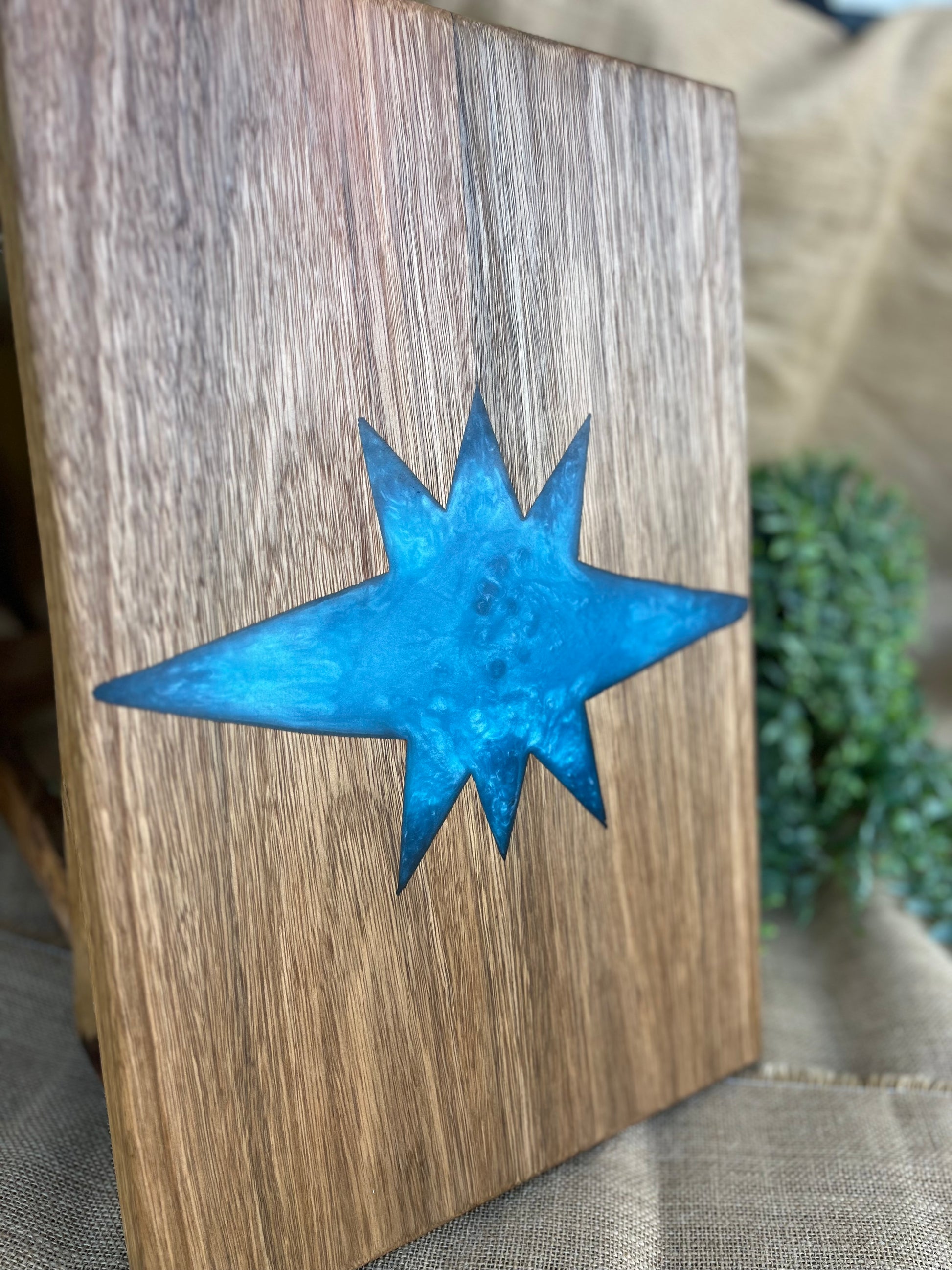A sleek resin inlay adds a contemporary edge, flowing seamlessly through the timber like a river, enhancing its organic character while creating a one-of-a-kind aesthetic. The resin is food-safe and adds both strength and visual appeal, making this piece as functional as it is beautiful.